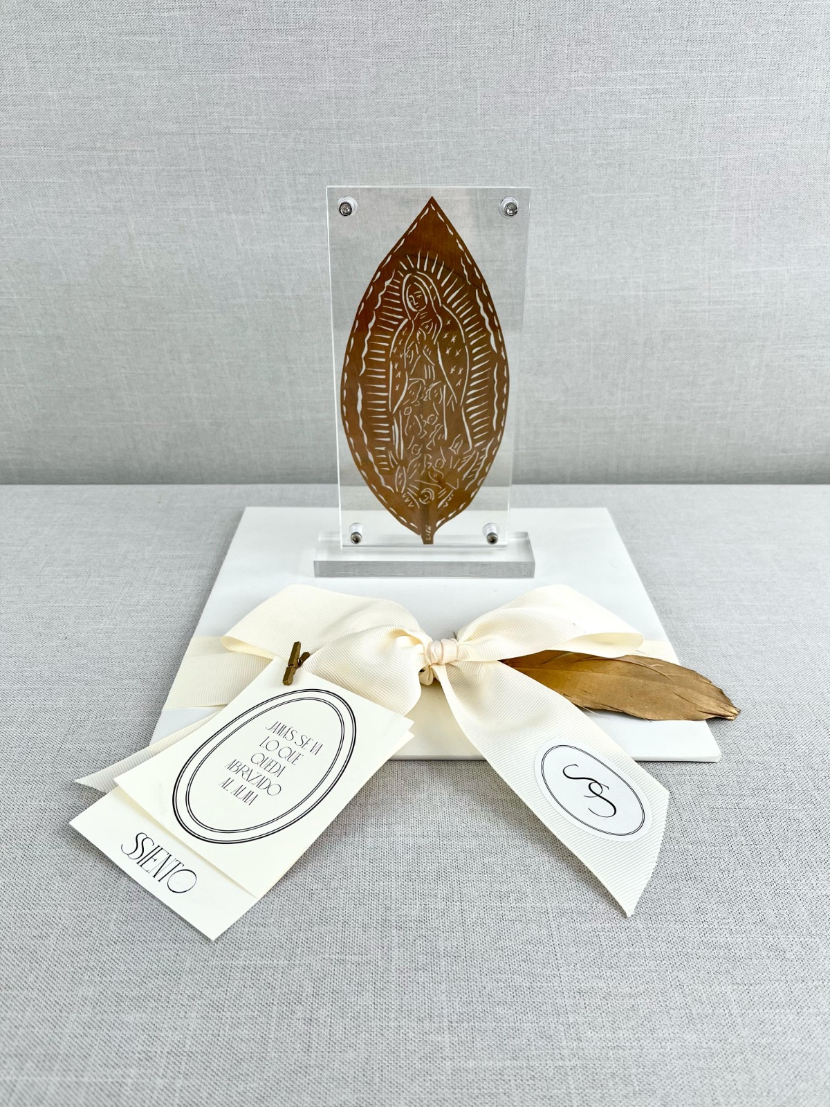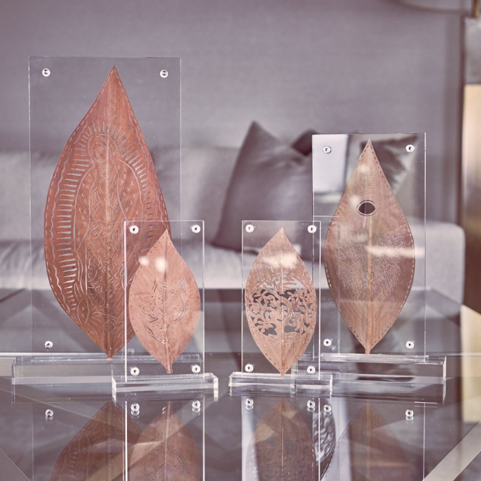Artesanías únicas de Hoja Seca labradas a mano, enmarcadas en acrílico con base.